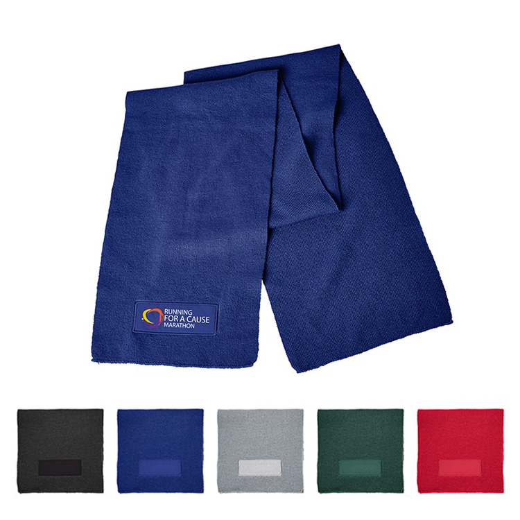 Keep warm with 100% Acrylic knit scarf with Cotton patch on end for decoration.