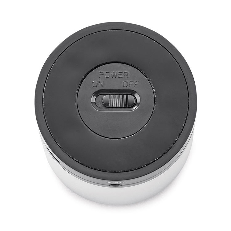 Aluminum alloy casing with chrome accent on speaker grid, black trim and a LED status indicator.
