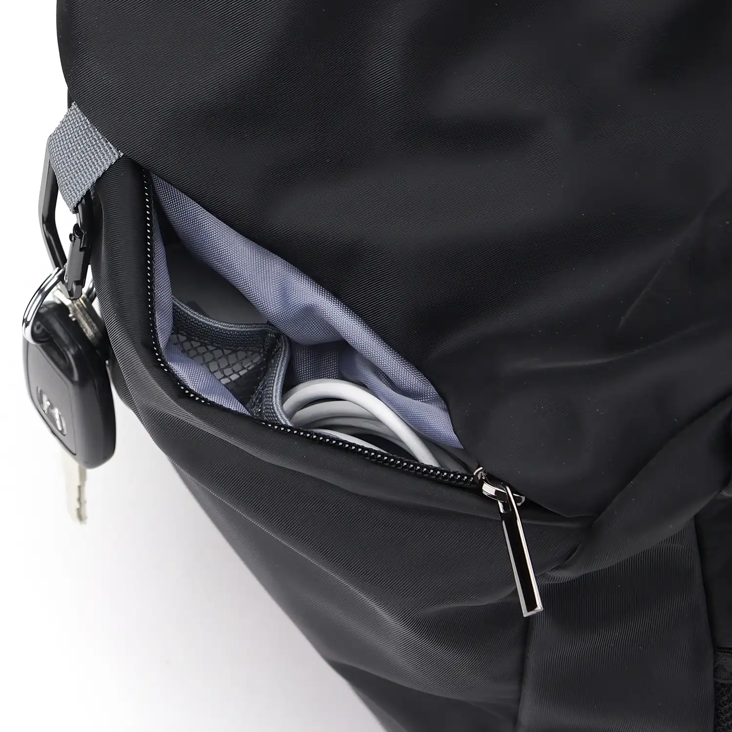 Easy access gadget pocket with carabiner and 2 mesh dividers.