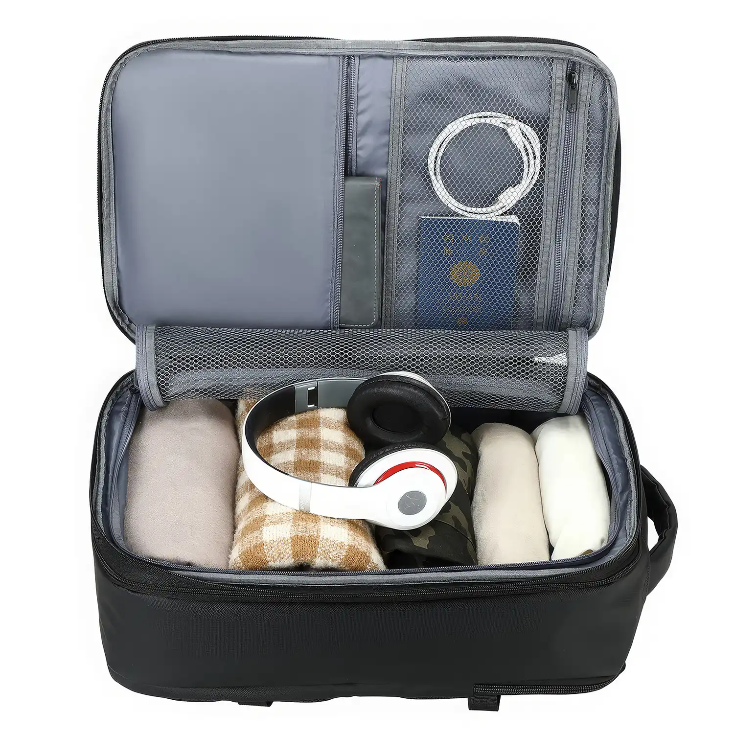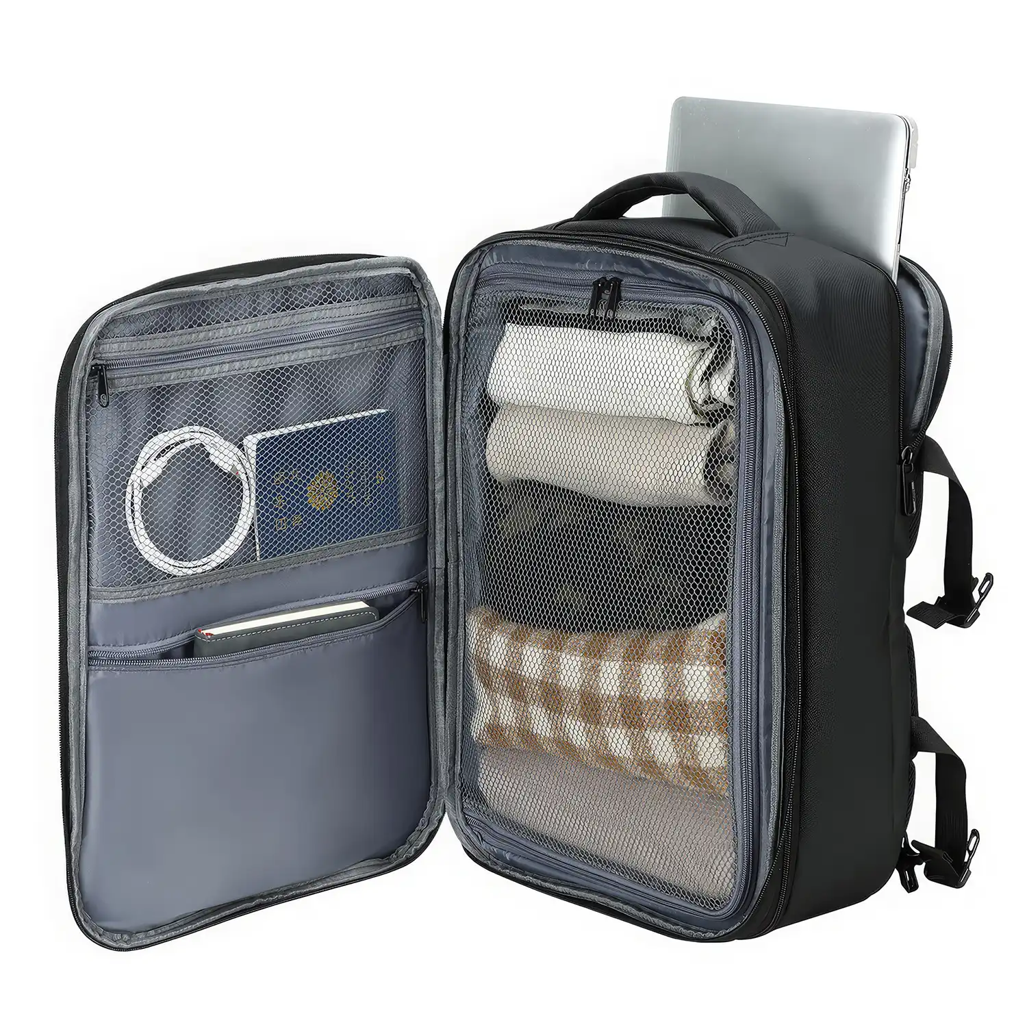 Interior mesh pockets and organization panels keep clothing, tech, and accessories neatly arranged.