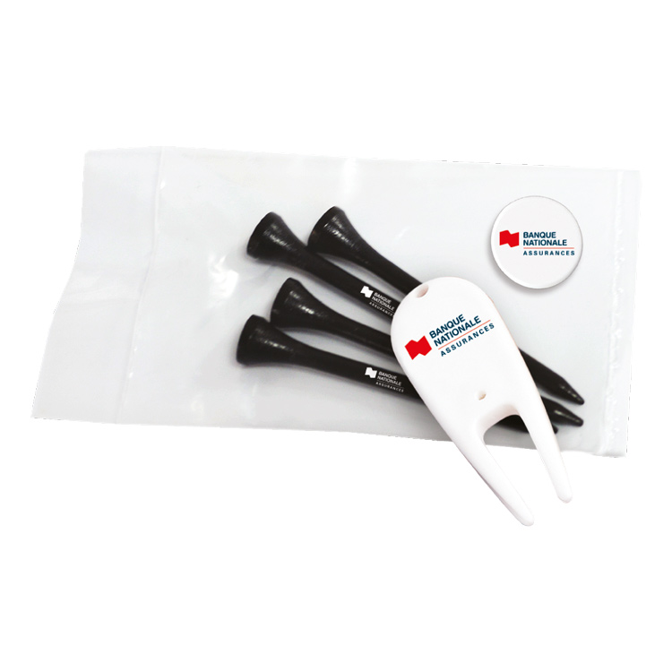 Bag of 4 tees with 1 marker and 1 Divot Fixer.
