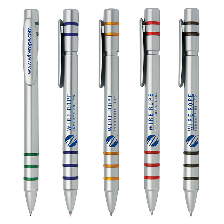 Silver plastic pen with colored rings.