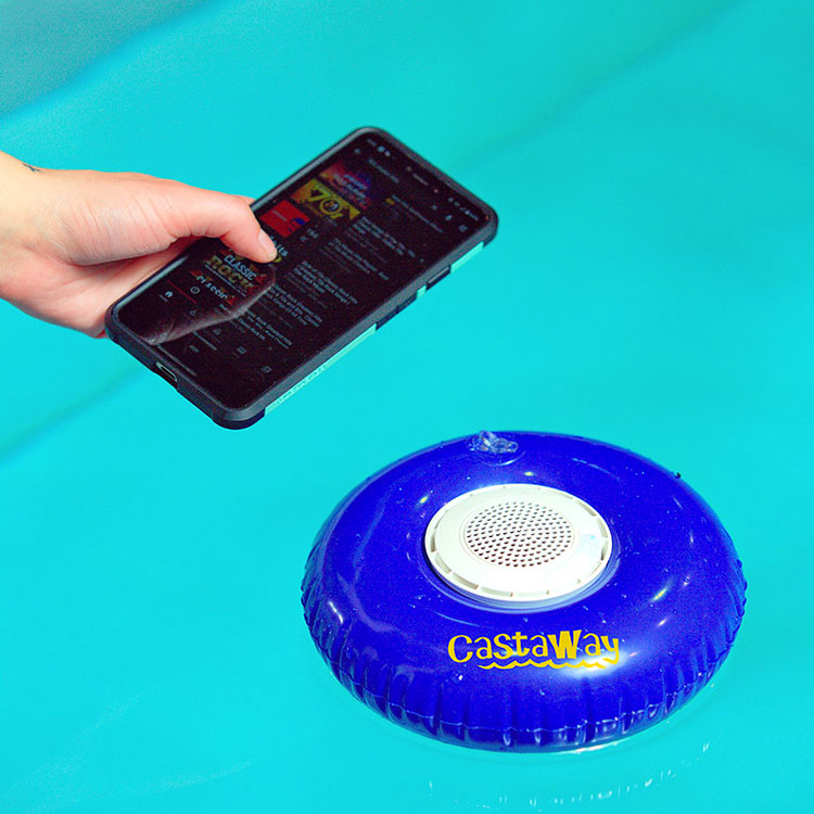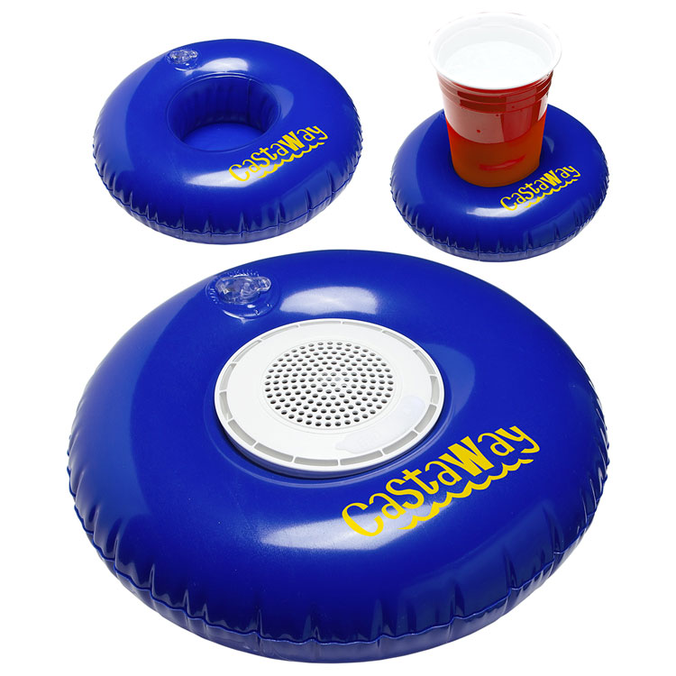 Add a logo to this Castaway Speaker Set Inflatable Swim Ring with Waterproof Wireless Speaker.