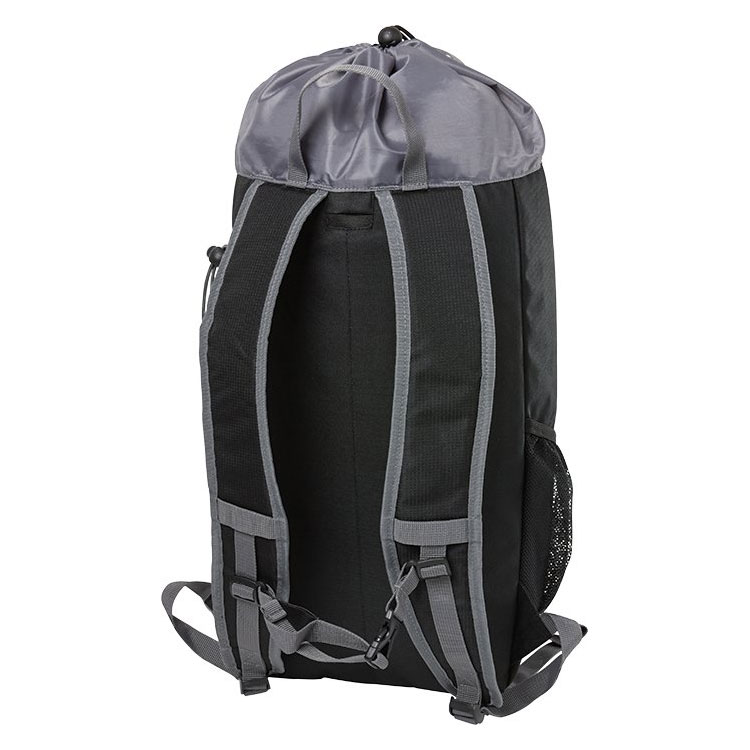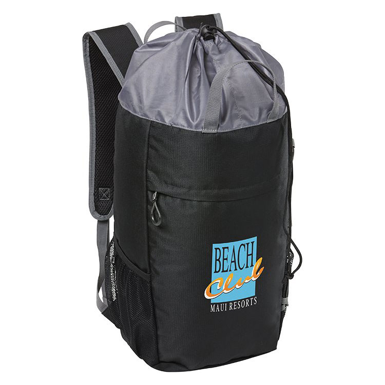 Features a large main compartment with cinch closure, a front zippered pocket.