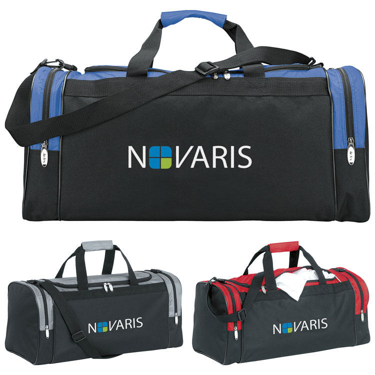 Large main compartment with U-shaped zip closure, two large side zip pockets.