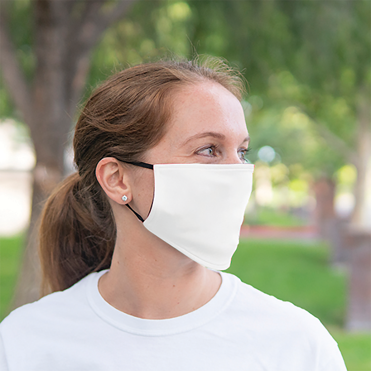 Non-medical one-piece face mask with soft and stretchable nylon ear bands.