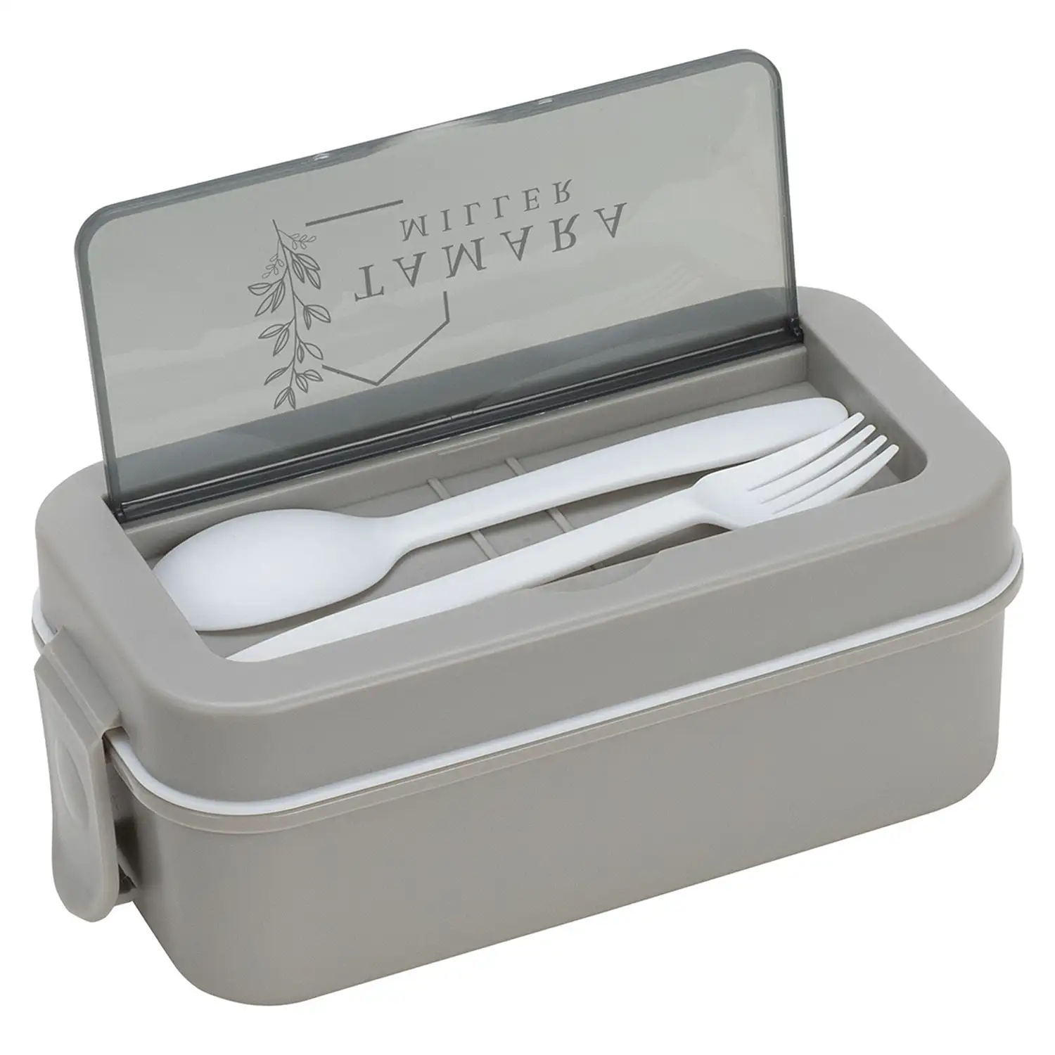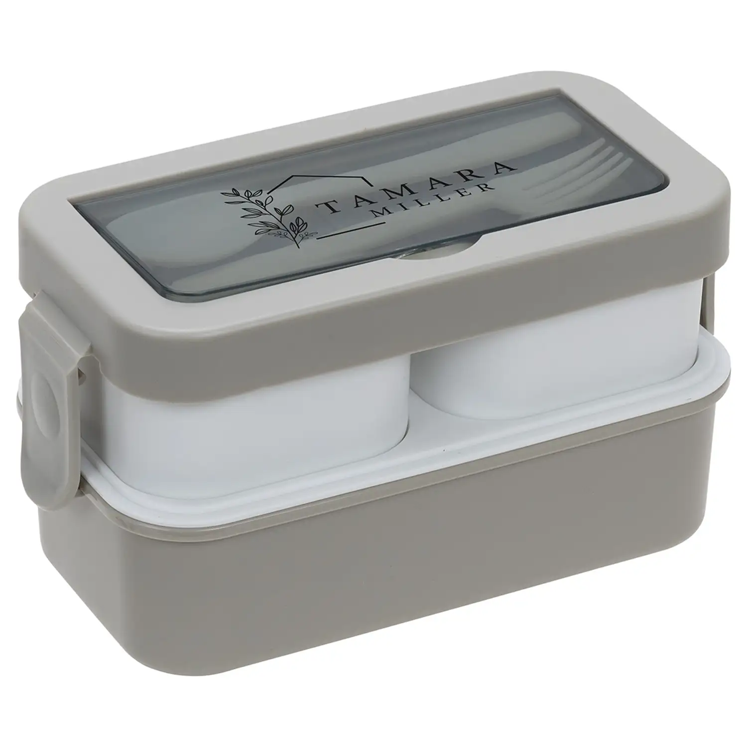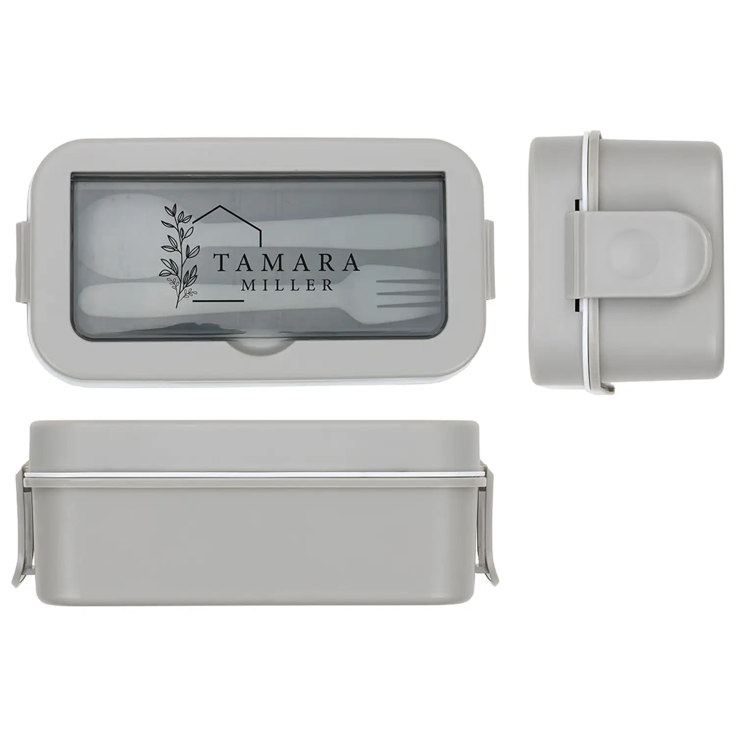 Promote your brand with this Connoisseur 3-Compartment Stackable Lunch Box with Utensils.