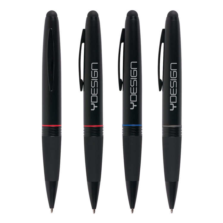 Brass twist pen and stylus with black chrome plated clip and a color ring. Individual cello bag.