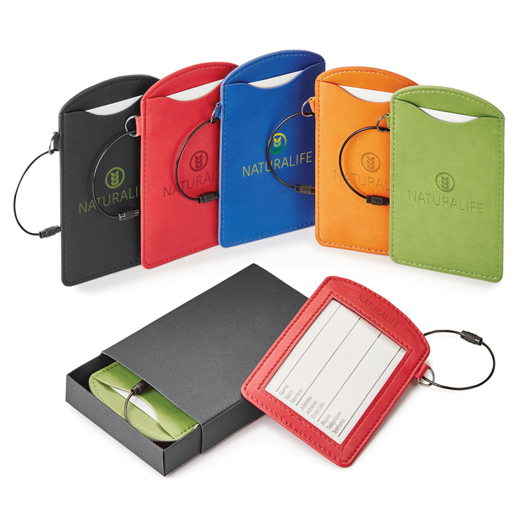 Enter our stylish Donald vinyl luggage tag with its wide window display and secure black metal wire closure.