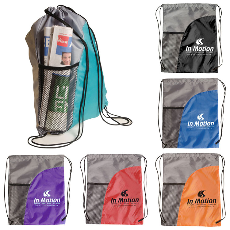 Drawstring backpack/tote bag made of two-tone polyester with a front mesh pocket.