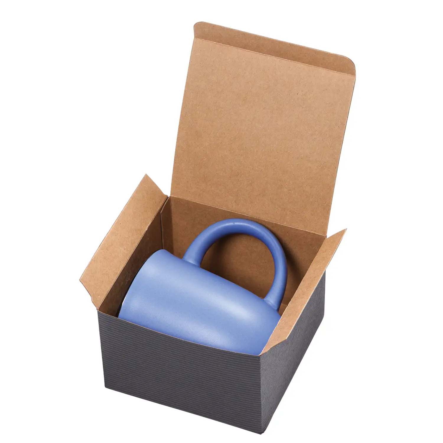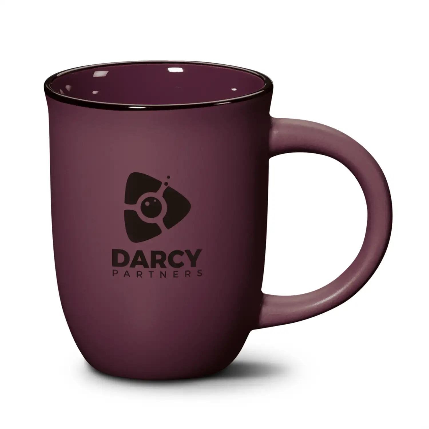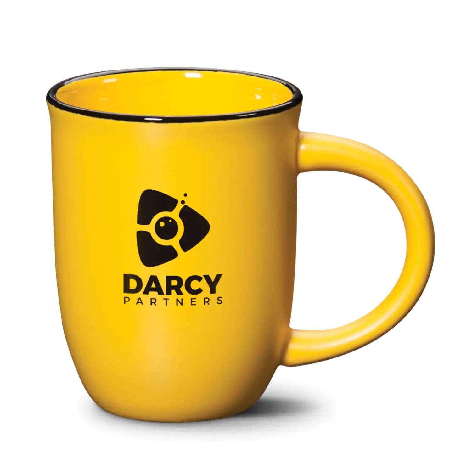 The subtle, sleek curved surface of the Fiona ceramic mug bells out gently at the top for an easy sip of freshly brewed coffee while the black glazed rim accent punctuates your brand message.