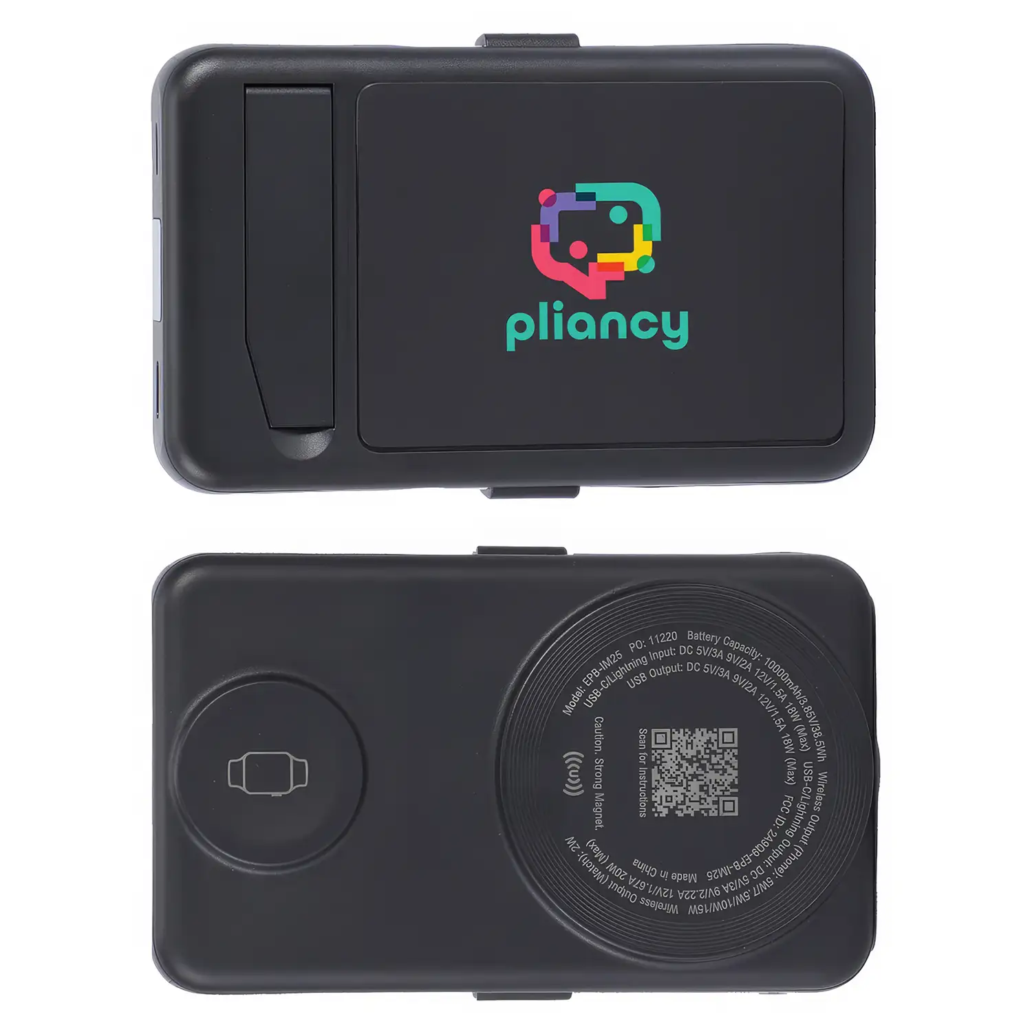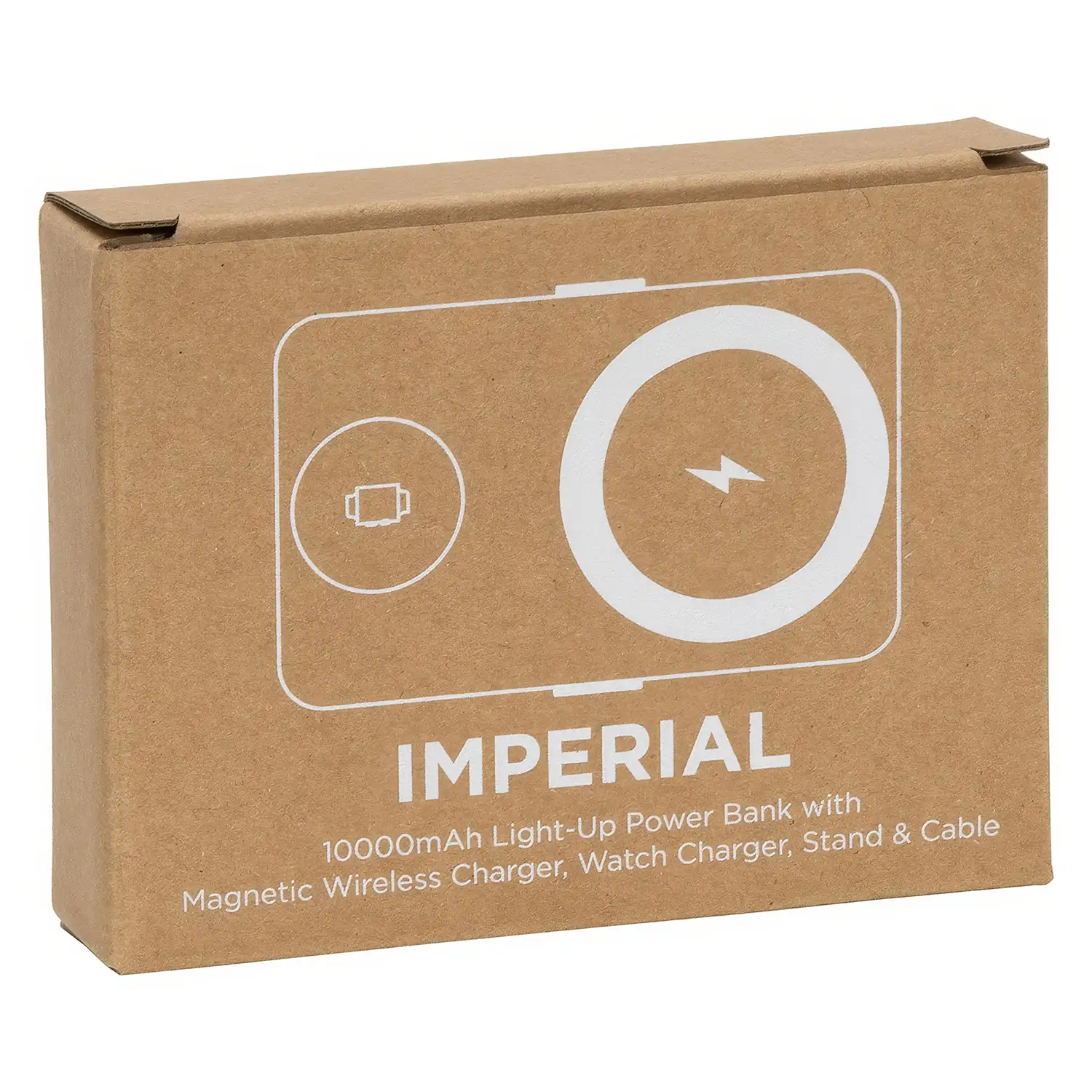 Promote your brand with the Imperial 10000mAh Light-Up Power Bank with Magnetic Wireless Charger, Watch Charger, Stand & Cable.