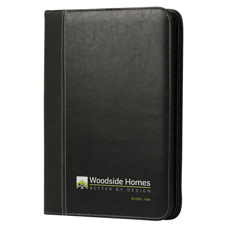 Leatherette black portfolio with zipper closure and a basic 6 fonctions solar calculator with large numbers.