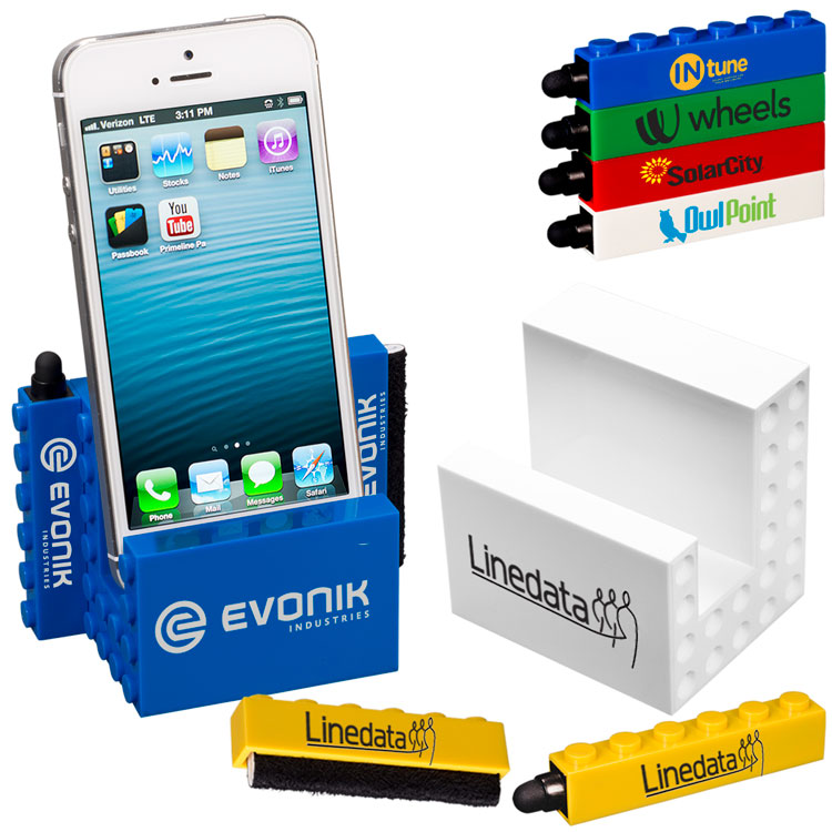 Combines the Logo-Blox Phone Stand with the Logo-Blox Stylus and the Logo-Blox Screen Cleaner.