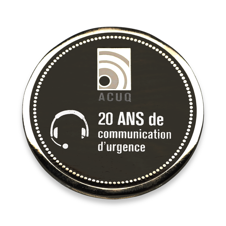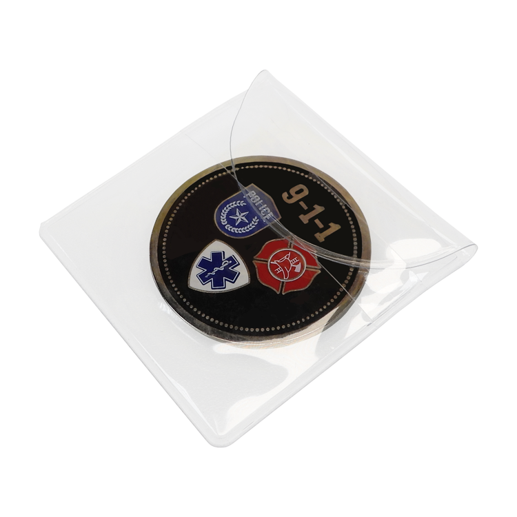 A metallic silver coin is a unique commemorative item for an event.