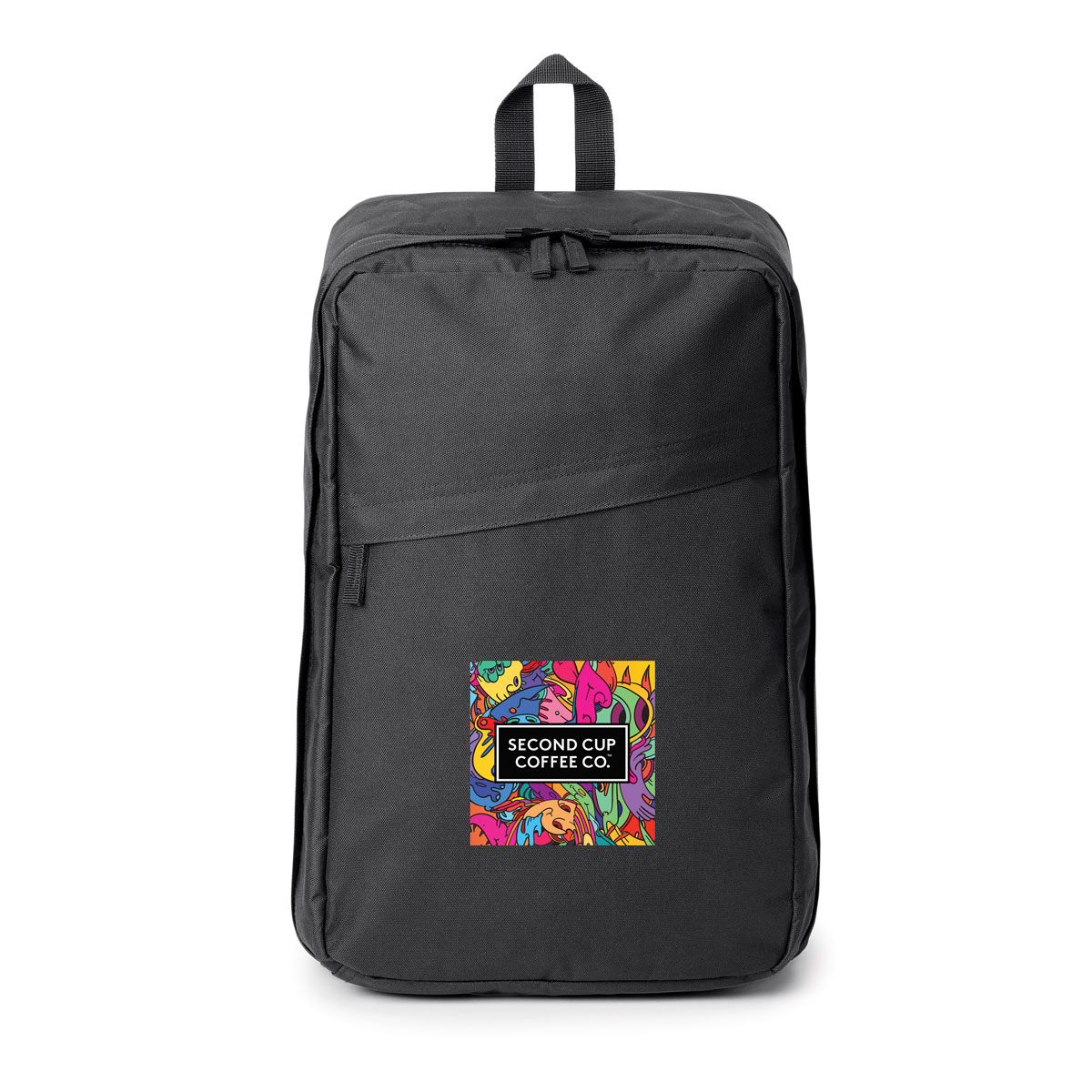 Default branding on the Renew Digital Nomad Backpack is silk screen centered below the zipper.
