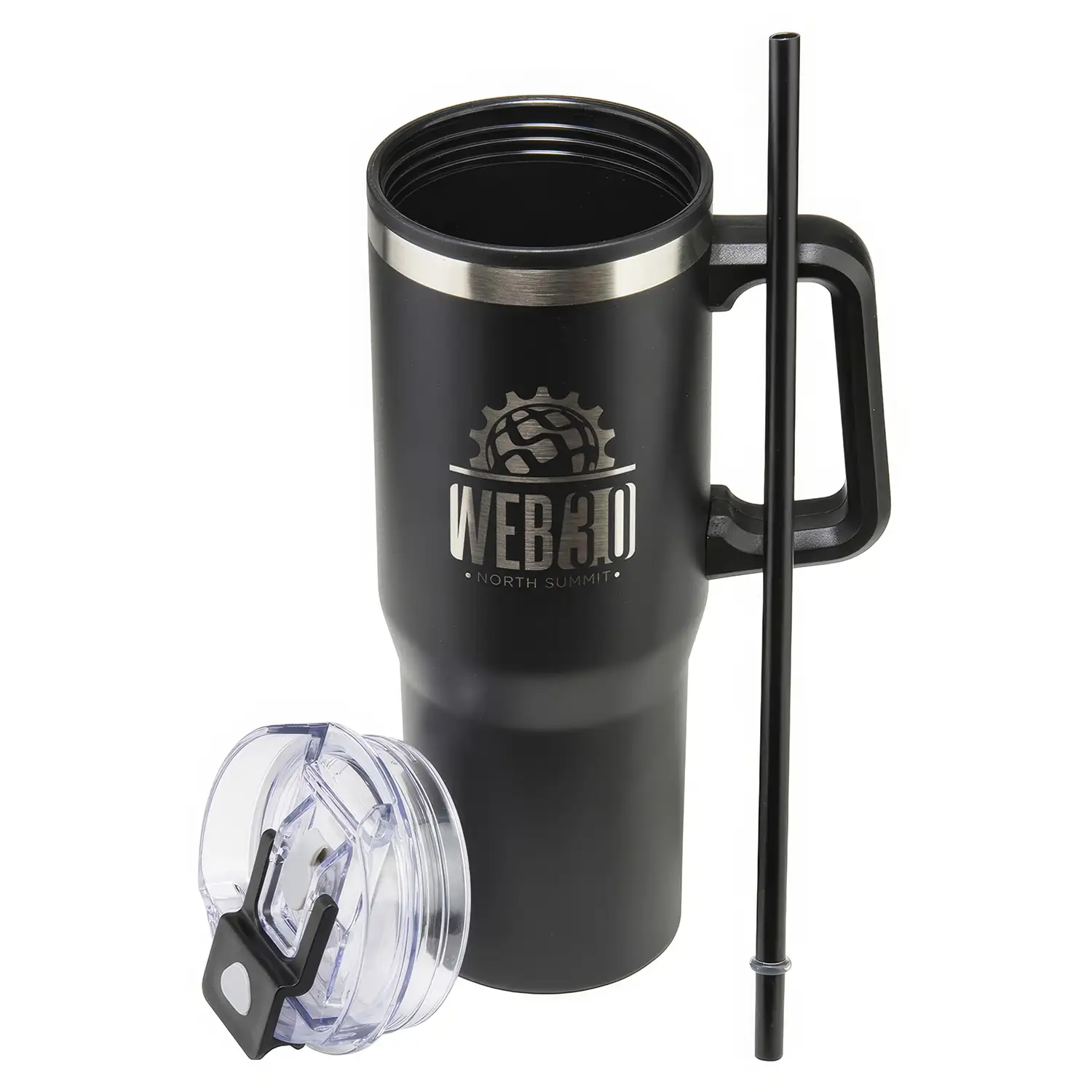 30 oz mug made of stainless steel outer shell with black polypropylene inner lining.