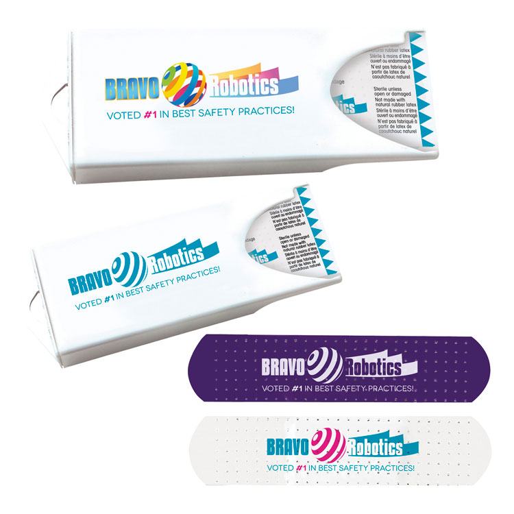 Get your ad noticed with these popular, highly visible dispensers and bandages. This white dispenser includes five custom printed white bandages.