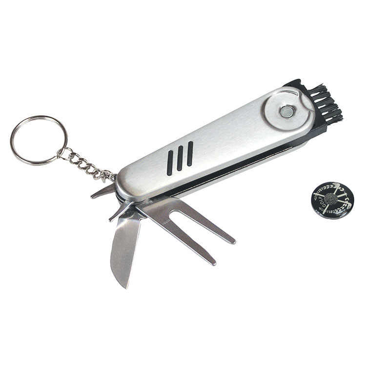 Tool includes green fixer, divot repair tool, brush, groove cleaner, cutting blade and domed ball marker.