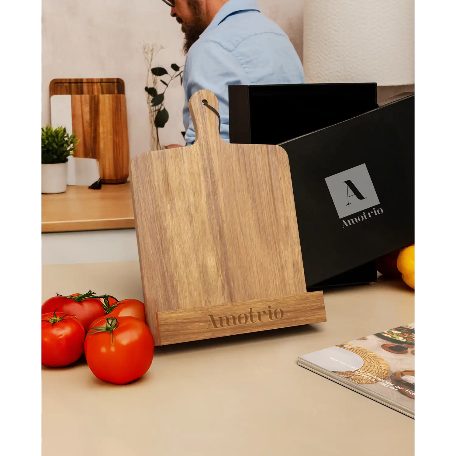 Crafted from durable, richly grained acacia wood, this holder is designed to prop up a cookbook or even a tablet.