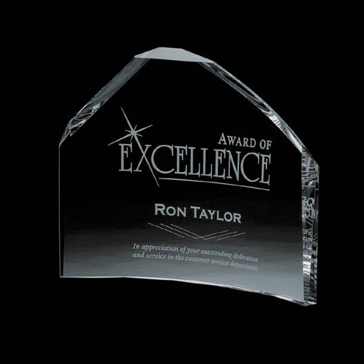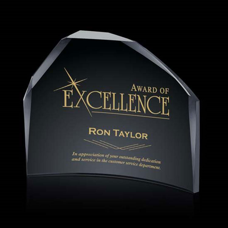 Beautiful custom shaped crescent award. Optional colorfill. Available in Starfire, Black or Blue.