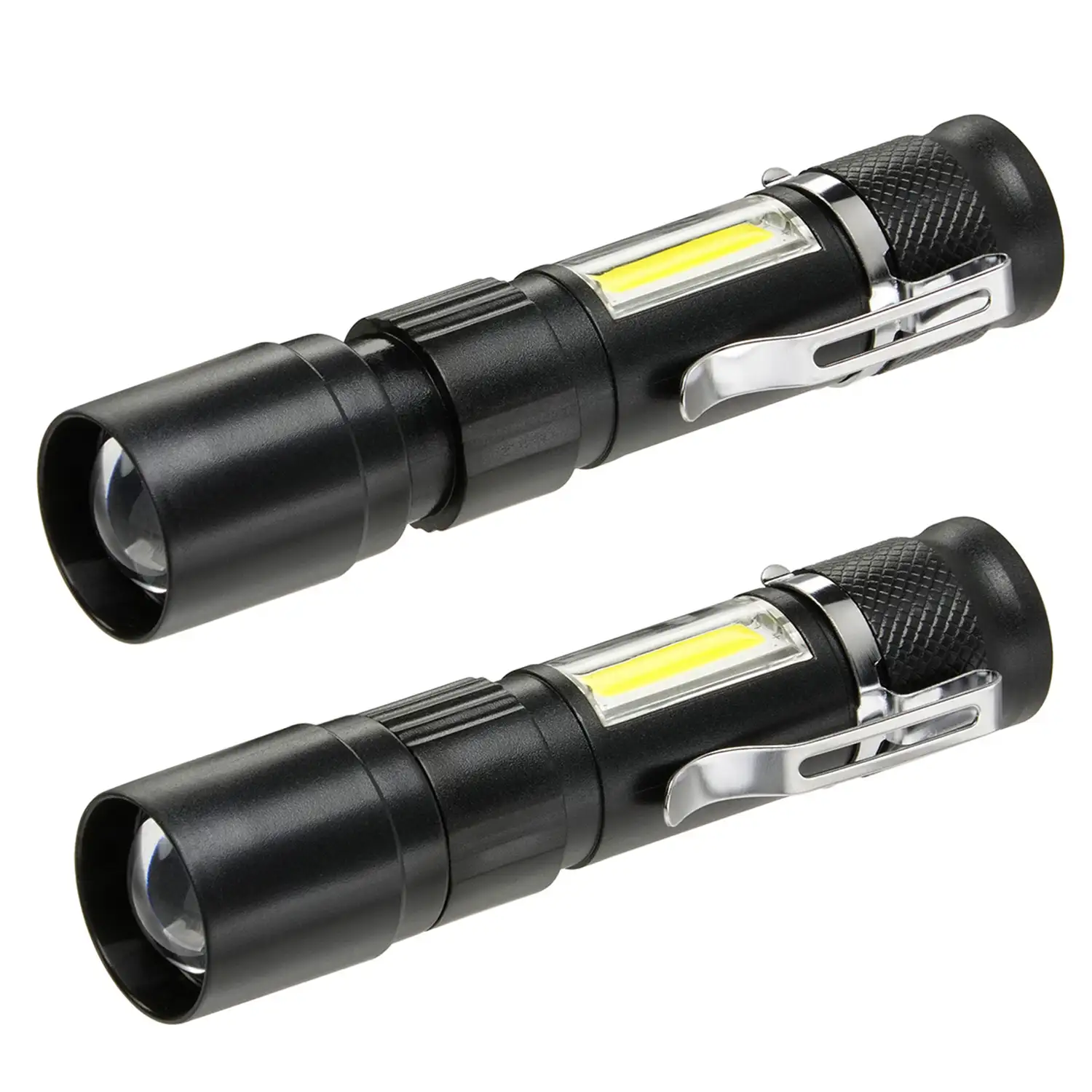 LED torch light on front, bright COB light panel on side.