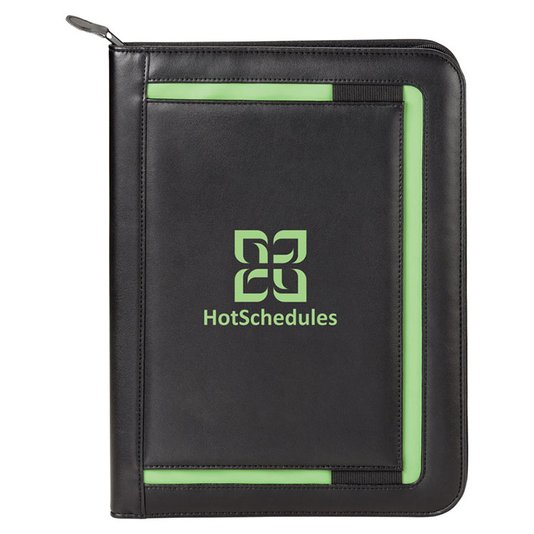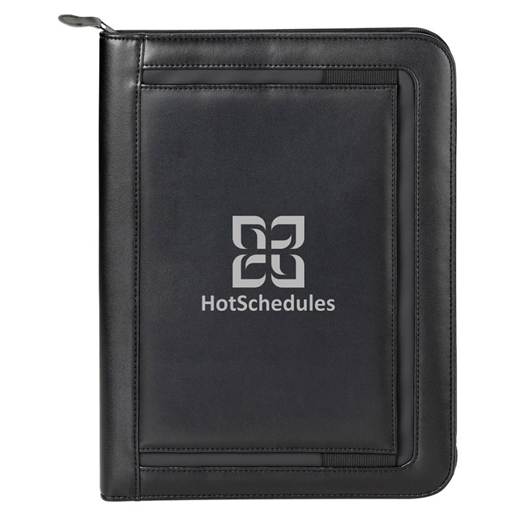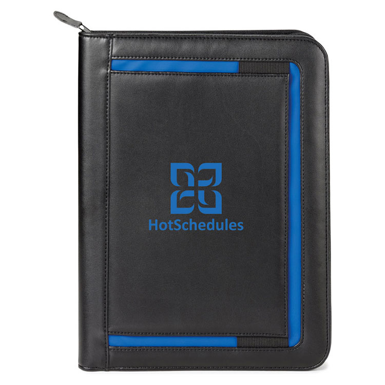 Silvio vinyl padfolio with colored trim, decorative stitching, zip closure, internal elastic pen loop, large gusseted pocket with a battery and solar powered calculator, 4 card slots, 3 disk slots and a refillable 20 sheet white lined 8 1/4" x 11 5/8" notepad.