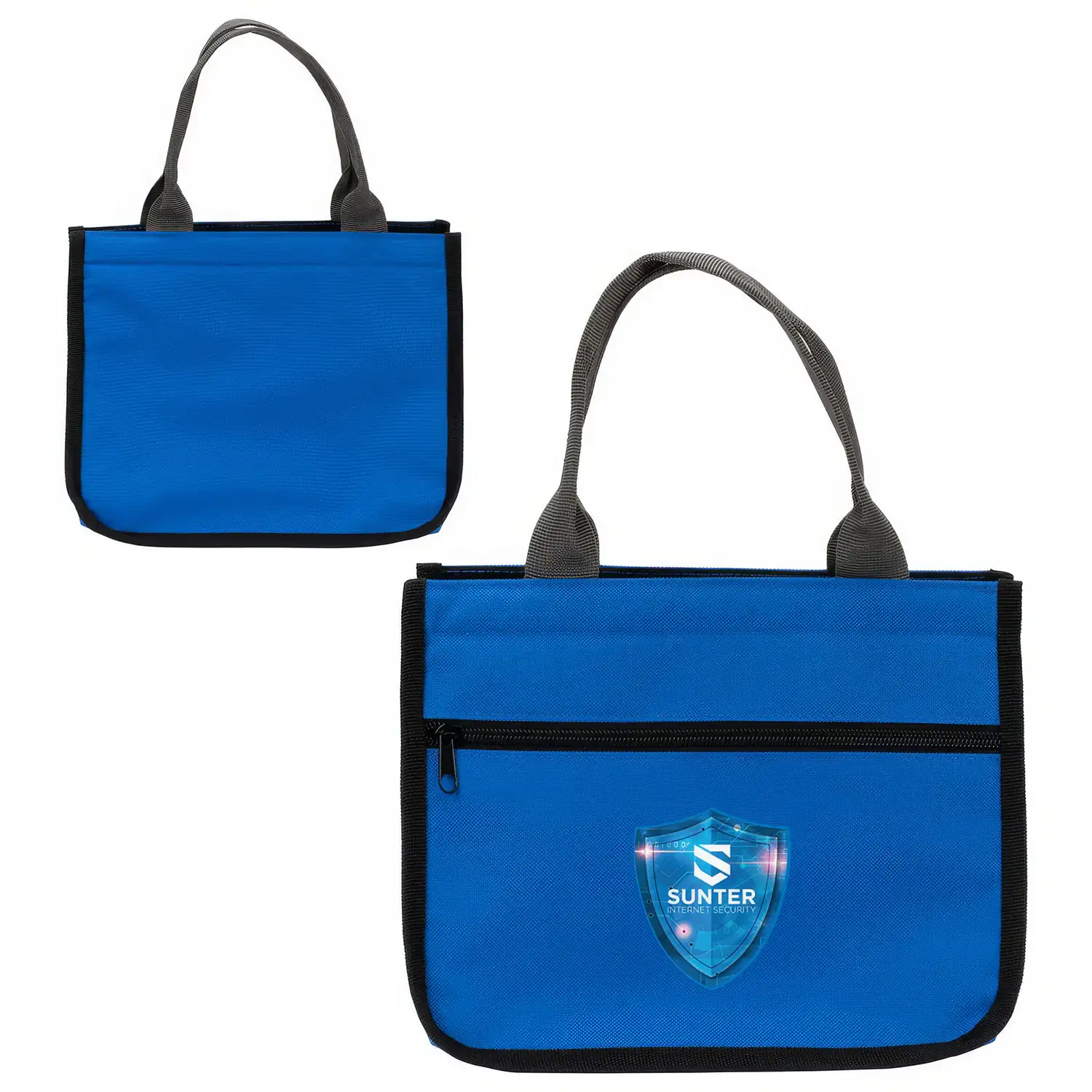 Fastener strips at top of tote for closure.