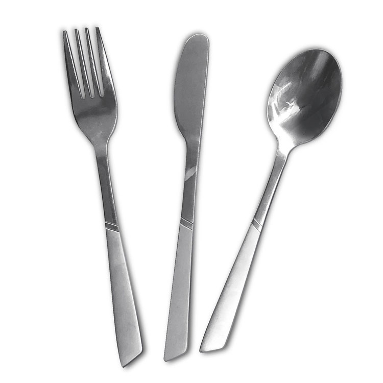 18/8 food grade stainless steel spoon, fork and knife packed in a neoprene pouch.