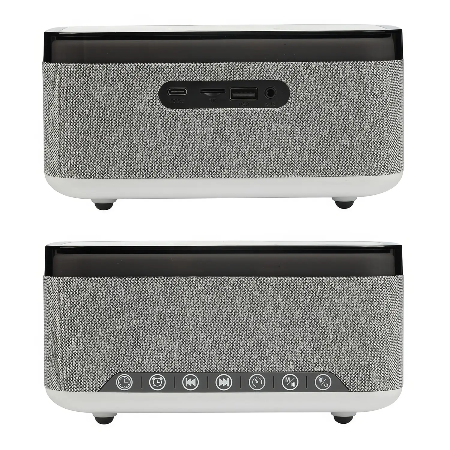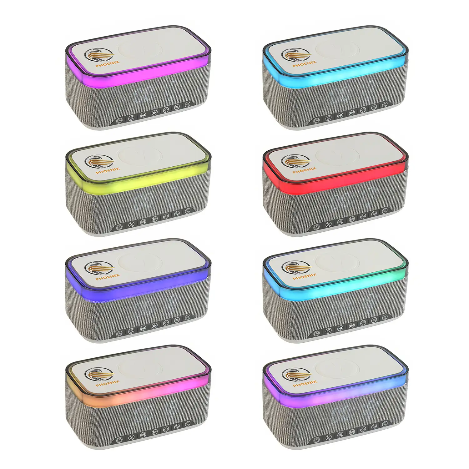 Combination of digital clock, wireless charger, speaker and white noise machine.