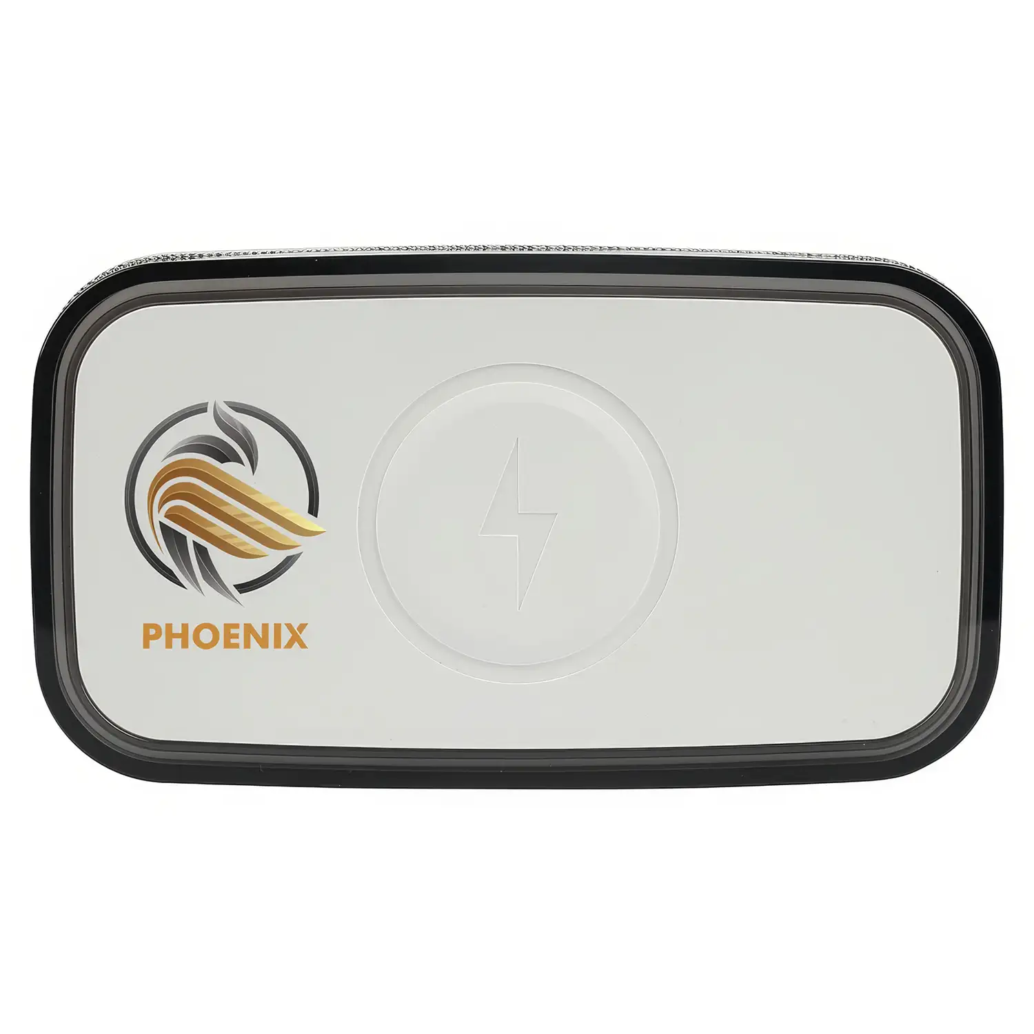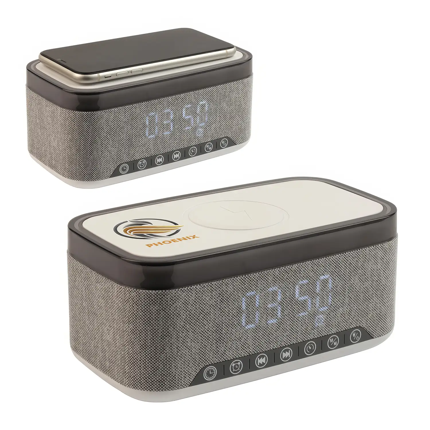 Promote your brand with the Sunset 20W Stereo Speaker with White Noise, Clock, Radio and 15W Wireless Charger.