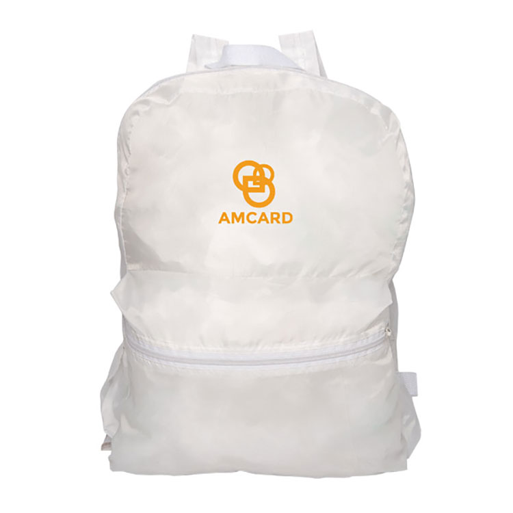 Backpack has a front zippered pocket, adjustable straps and a top carry handle.