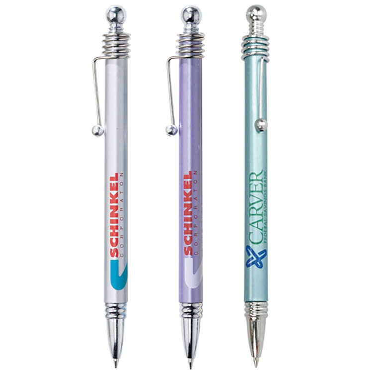 Plastic spring action spiral accent pen featuring metallized color barrel and chrome trim.