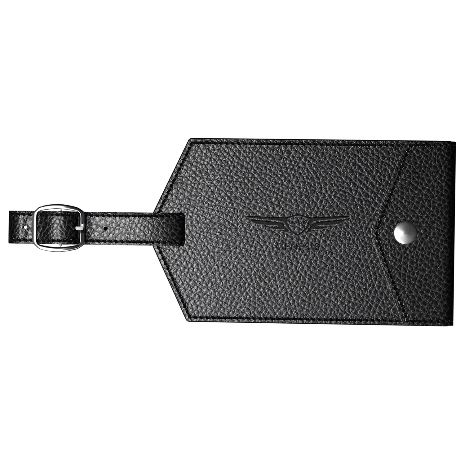 The Vanguard Dual Card Luggage Tag, crafted from durable vinyl, includes a chrome finish metal snap button closure, and comes with a personal info card.
